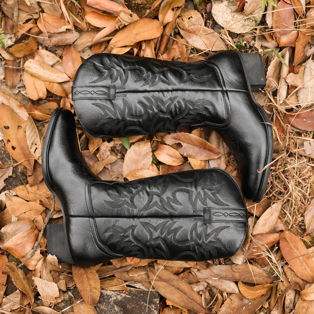 Classic Western Cowboy Boots – Handmade Embroidered Mid-Calf Pull-On Boots Vegan Leather