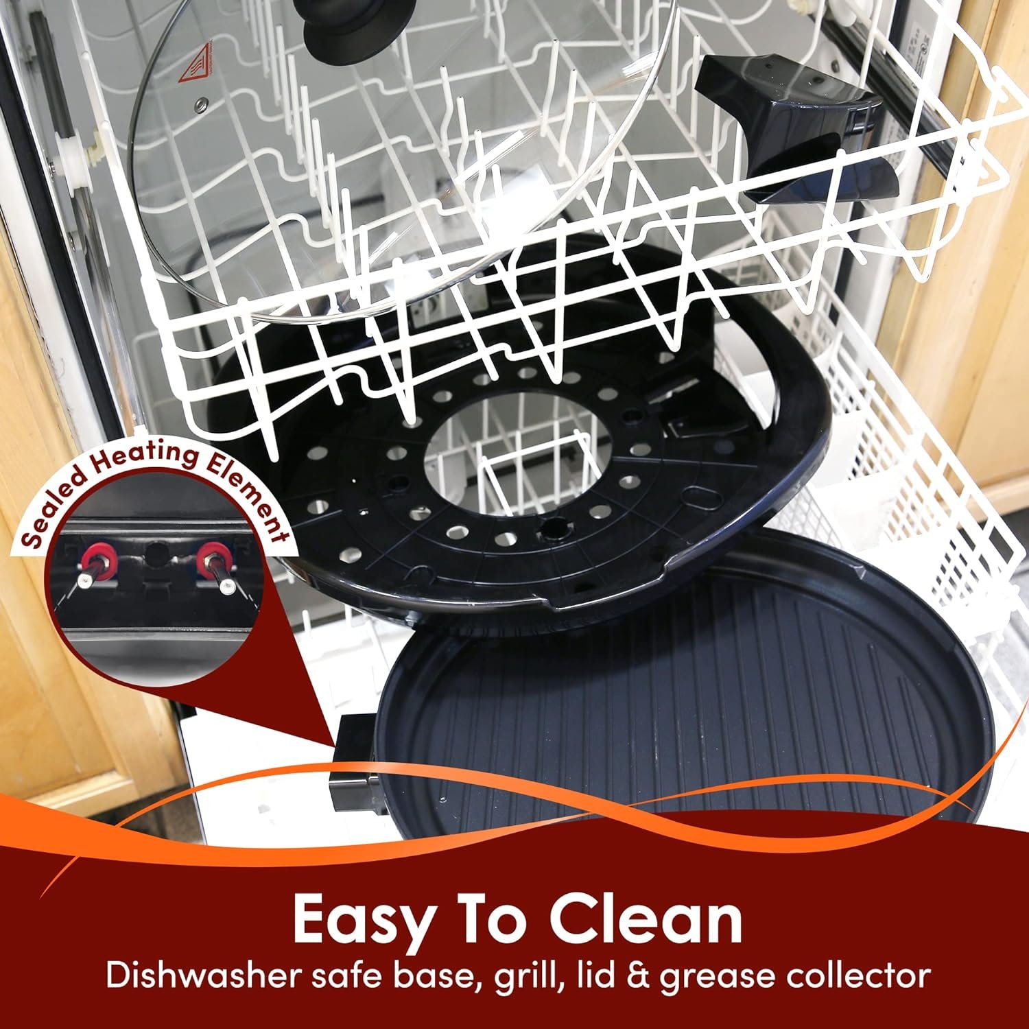 DISHWASHER-SAFE PARTS: The drip pan, glass lid, and grill plate are all detachable and dishwasher-safe for hassle-free cleaning.