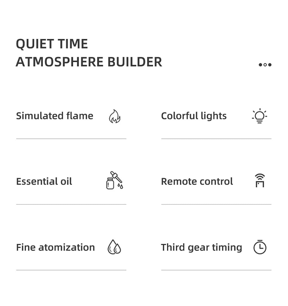 【Soothing Fireplace Experience】Transform any room with a hypnotic, realistic flame effect that cycles through warm ember glows, multicolor dreamlights, or calming solid hues. More than an oil diffuser for home, it’s a mesmerizing visual escape that brings the comfort of a fireplace right to your bedside or desk.